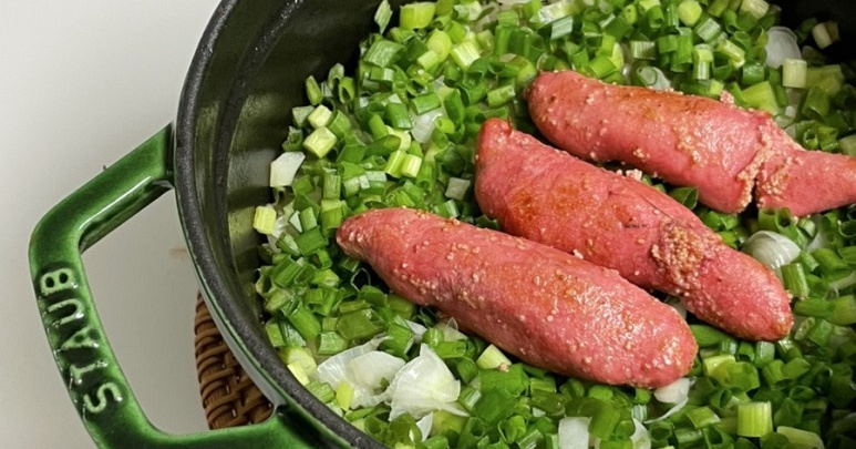 명란젓을 제거한 냄비에 대파를 넣고 볶아 파향을 냅니다.